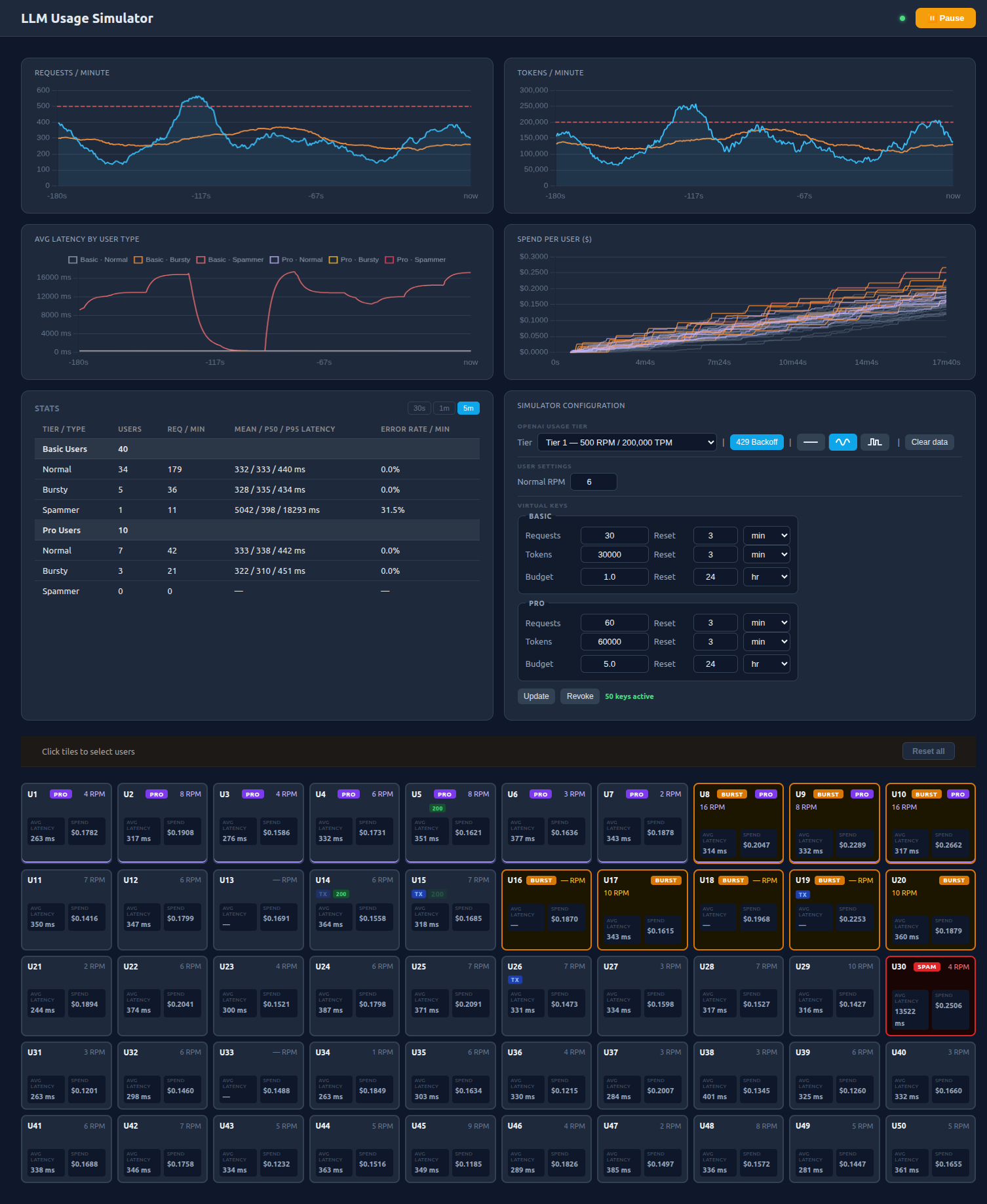 This is the user tile that has hit the $1 budget and can no longer send requests. Ignore the blistering RPM and latency it’s because the simulator doesn’t back off on 402 errors.